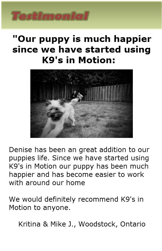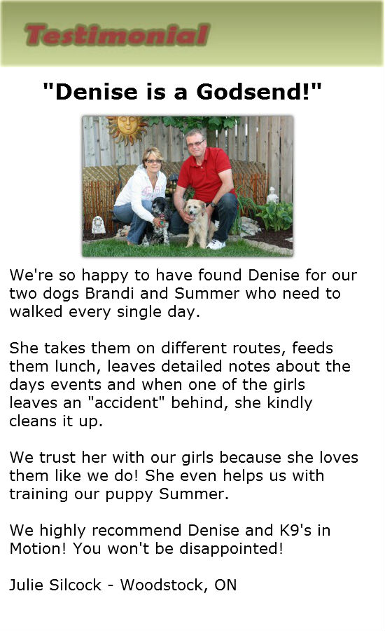 K9's in Motion understands how today's fast paced lives and unexpected events can quickly become overwhelming and for this reason when you can't be there for your dog(s), we want to help! Allow us to come to your home and let them out for a quick pee break, walk and even feed them, all to make life easier for you.